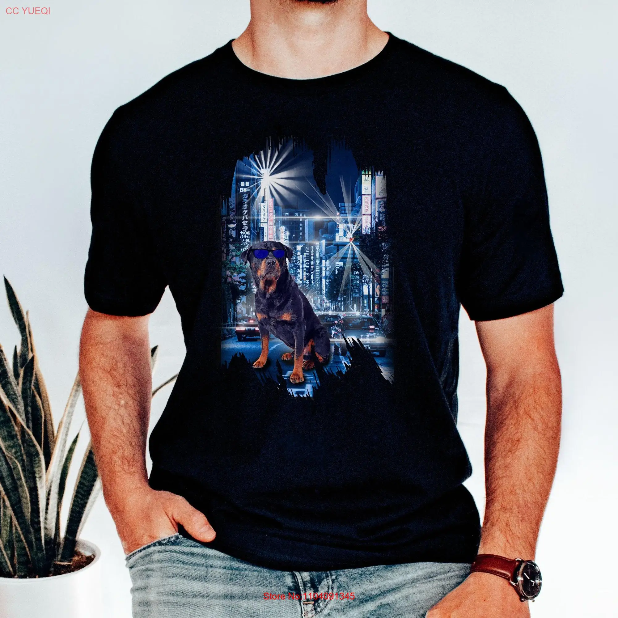 Rottweiler in Tokyo Dog Japan Retro 80's Music Vaporwave Streetwear T Shirt Futuristic Foodies Fan long or short sleeves